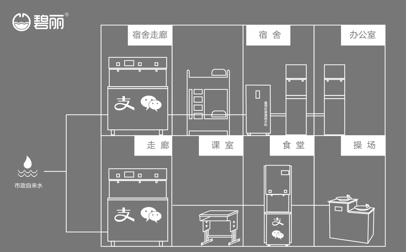 碧丽面向高校不同场景的饮水需求,提供多套整体饮水解决方案