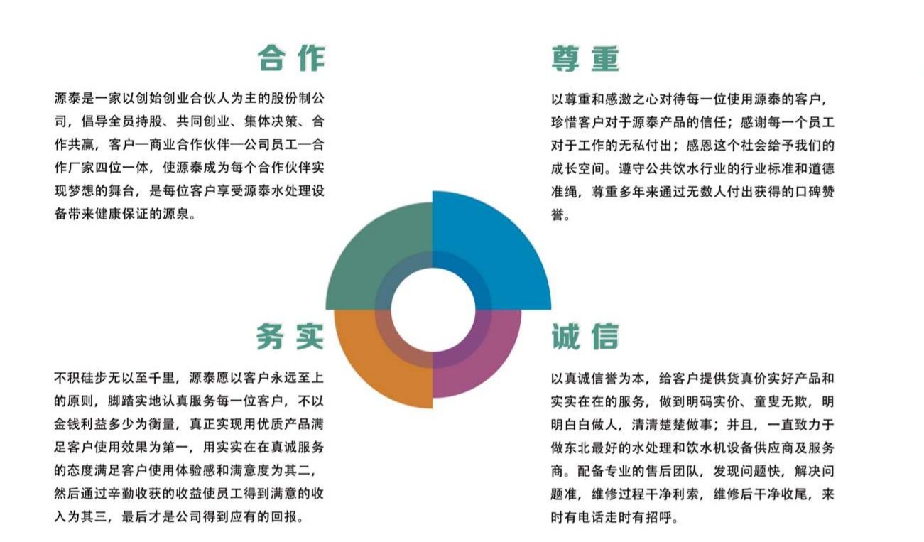 源泰公司是一家以创始创业合伙人为主的股份制公司,倡导全员持股、共同创业、集体决策、合作共赢,客户—商业合作伙伴—公司员工—合作厂家四位一体,使源泰公司成为每个合作伙伴实现梦想的舞台,每一个客户享受碧丽饮水机带来健康的源泉。